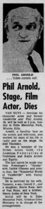 Starting in 1938 Phil was in a continuous string of films and television shows over the next 30 years, with only a slight pause from March 1941 to October 1945 while Phil played the role of Staff Sargent in the Army’s antiaircraft division during the little show called WWII. But I guess even then it wasn’t really a pause, because while he wasn’t fighting the good fight in the air he was producing G.I. shows as an extra-duty activity. In addition to keeping his entertainment talents well-greased during the war, Phil also found time to court and marry Tamarra “Tillie” Franklin (1914 – 2001), who also performed in local theater back in Iowa before the war, while both were stationed in Texas. After the war they settled for good in Los Angeles, and in 1946 their first born, a son, would arrive, followed by Maria Rose Arnold in 1947.