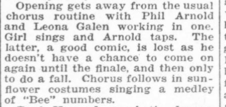 “Opening gets away from the usual chorus routine with Phil Arnold and Leona Galen working in one. Girl (I assume they meant Galen) sings and Arnold taps. The latter, a good comic, is lost as he doesn’t have a chance to come on again until the finale, and then only to do a fall.”
