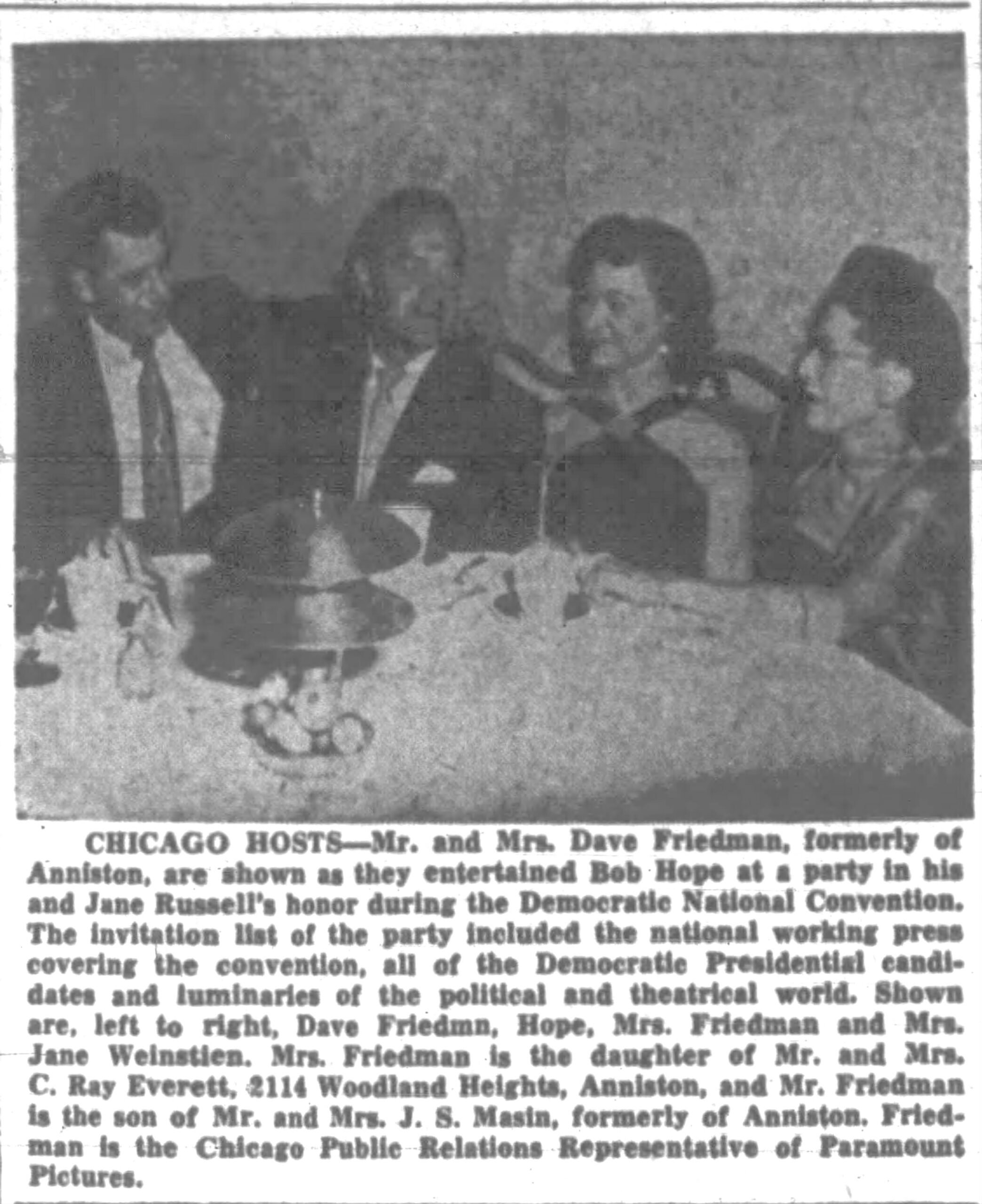 A few months ago I came across a news article in an Alabama paper from the summer of 1952 about David F Friedman (DFF for the duration) and his wife hosting a dinner for Bob Hope and Jane Russell during the Democratic National Convention which was being held in Chicago, where DFF was of course then based. My first thought was this was obviously part of Dave’s job with Paramount (which it was), but then the hint of a memory started to stir in the backwater recesses of what passes for my brain, something that I recalled was possibly in DFF’s book “A Youth in Babylon”. So off to one of the dust-covered shelves in my office I went. And yep, DFF has an entire section about the 1952 DNC and Bob and Jane, and a rather great story about how he used Ms Russell and one of the contenders for the Democratic Nomination as pawns in his exploitation of SON OF PALEFACE. But digging further, as I tend to do, I found that there very well might be more to the story than DFF put in the pages of his book!