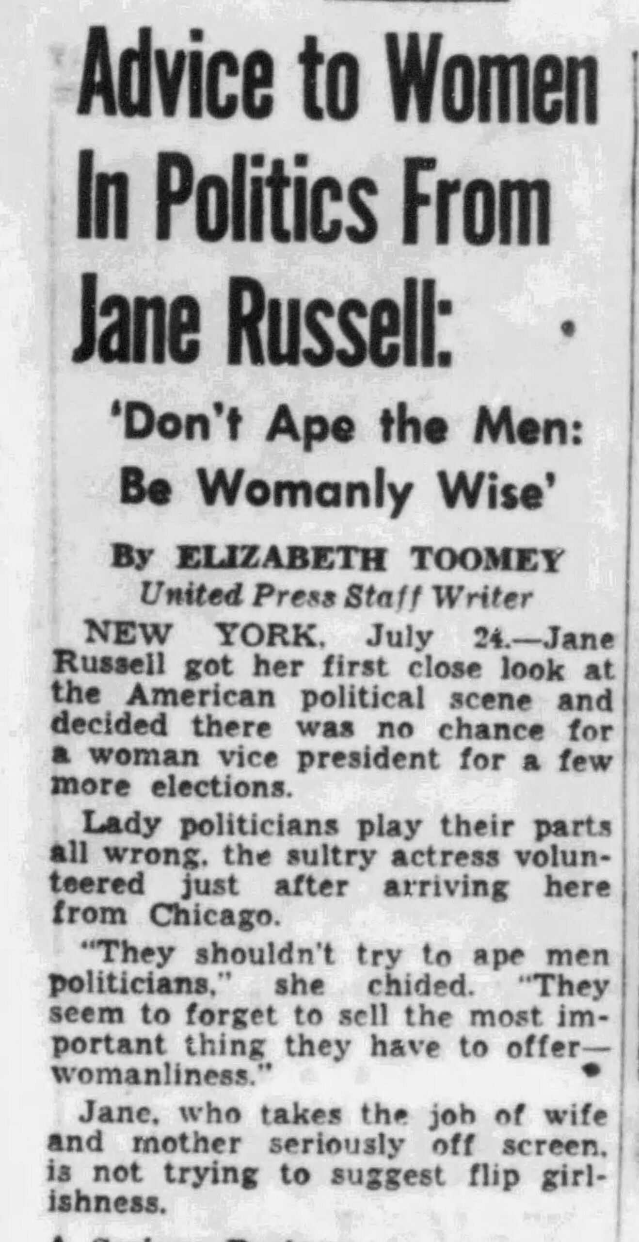 - And finally, about how husbands shouldn’t be embarrassed if their wives are elected to office[8], “It wouldn’t be any harder than for a man married to an actress. Maybe it’s even easier, since he might feel she was contributing something more worthwhile.”