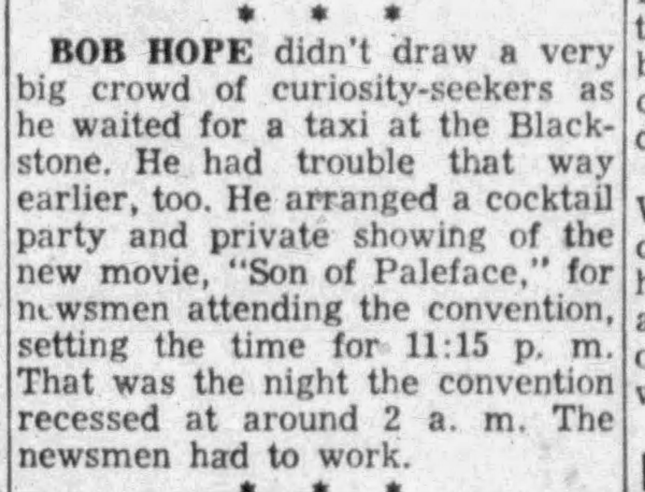 As already mentioned, DFF notes in A YOUTH IN BABYLON that the SON OF PALEFACE premiere was the same week as the DNC in Chicago, and that the film’s stars, Bob Hope and Jane Russell were on hand for the premier. He mentions the line around the corner at the Oriental Theatre for it’s 11:00 AM show. He mentions the police-car escort he’d setup for Ms Russells ride from the airport. But he didn’t mention something as important as Paramount (ie DFF) throwing what was supposed to be a big after-party planned for the night of the premier [9], with an invite list which included the entire press corps who were in town for the DNC, and as many of the politicians as would allow themselves to be seen at such an event (which I bet DFF was banking would be most of them!). Knowing how conventions go the party start time was set for a rather late 11:00 PM, anticipating the closing gavel to be around 10:30 as usual. But conventions can take on a life of their own, especially ones where no clear candidate has taken a commanding lead going into the start of the convention, and the 1952 Democratic Convention was just one of these gnarly beasts [10]. And on the night of the film’s premier the closing gavel didn’t hit until well after midnight, and at least one account hinted it might have been as late as 2:00 AM when the delegates, and the press, were finally released into the hot Chicago night. So the few folks that did wind up going to the SON OF PALEFACE After-Party showed up several hours late, several hours during which Bob and Jane and Dave and a ton of other Paramount folks waited, and waited, and waited. And those that did manage to drag themselves over to the supposed festivities were dead tired and not in much of a mood to party, regardless of the free food and drinks [11].